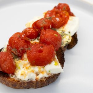 - Coloca la ½ burrata sobre la tostada, desmenuzándola suavemente.