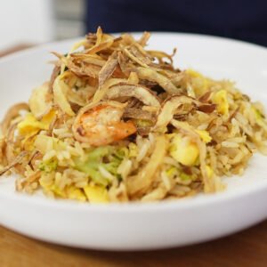 - Para finalizar agrega las tiras de huevo y remueve suavemente. Cocina un par de minutos más y sirve caliente, con cebollas fritas para darle un toque crocante.