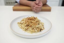 Arroz frito con setas enoki y cebollas crocantes