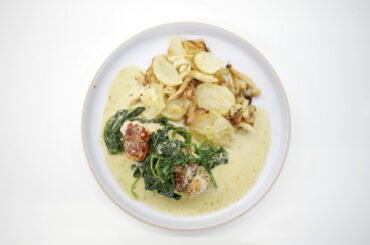 Cambia tu receta y aprende a cocinar Estofado de pollo con tomates secos, espinaca y papas asadas con cebolla y setas.