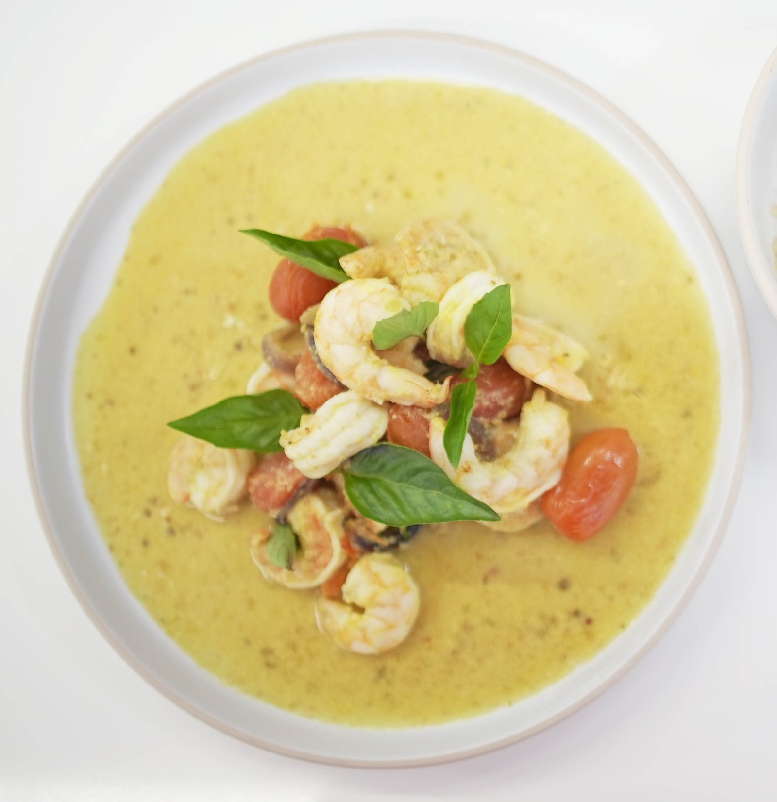 La Crema de zapallo con leche de coco y pincho de langostinos con pimienta de cayena, es una receta deliciosa para la hora de tu cena.