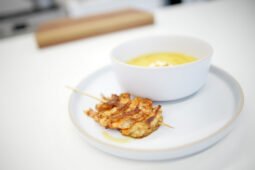 Crema de zapallo con leche de coco y pincho de langostinos con pimienta de cayena