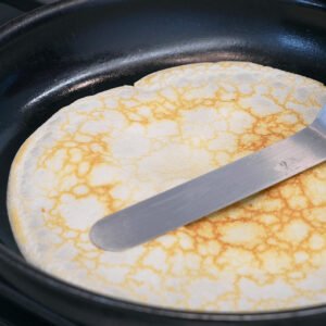 - Calienta una sartén mediana a fuego media y usando la taza medidora de ¼ asa los crepes uno a uno, asegurándote que te queden bien delgadas y parejas. Dóblalos y guardados en un plato hasta el momento de hacerlos en otra receta.