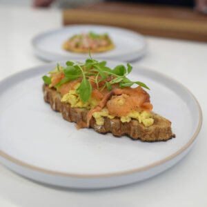 - Para finalizar la tostada, coloca las láminas de salmón curado dividiéndolas en 4 partes iguales sobre cada tostada con los huevos revueltos. Termina añadiendo algunos brotes de rúgula o berros.