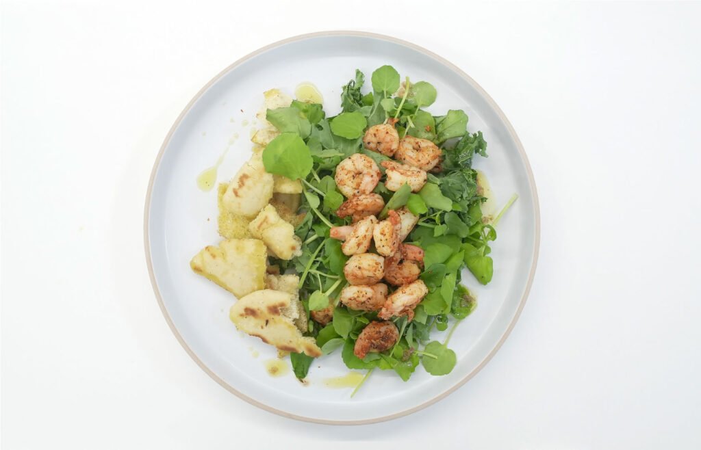 Ensalada tibia de camarones con especias Cajun y pan pita tostado