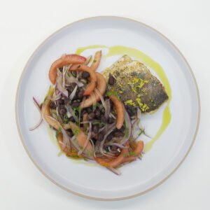 - Para servir, coloca el filete de corvina en el centro del plato con la piel hacia arriba y, sobre la mitad del filete, sirve la ensalada. Si es necesario, añade un poco más de aceite de oliva y sirve inmediatamente.
