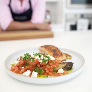 - En una sartén a fuego medio, asa el pescado empezando por la parte de la piel, cuando la piel esté dorada, das la vuelta y lo asas hasta lograr el termino de cocción deseado. (unos cuatro minutos para término medio). Apenas esté, lo sirves de inmediato con las papas y las berenjenas aderezadas con el restante del aceite de oliva, los tomates cortados en cubos pequeños, el queso feta en boronas, el zumo de 1 limón, sal marina, pimienta negra a tu gusto.