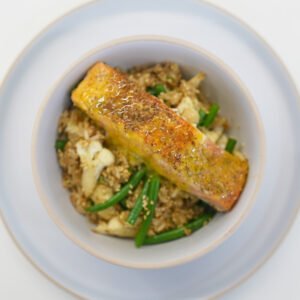 • Mientras la coliflor se saltea, calienta una sartén con un poco de aceite. Coloca los filetes de salmón con la piel hacia abajo y ásalos hasta que la piel esté dorada y crujiente. Luego, dales la vuelta y cocínalos al punto de cocción deseado.