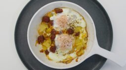 - Regresa la chistorra a la sartén y haz pequeños espacios entre las papas y la cebolla para colocar los huevos. Cocina a fuego medio-bajo hasta que las claras estén firmes pero las yemas sigan ligeramente líquidas. Sirve de inmediato.