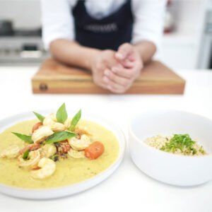 Camarones al Curry y Leche de Coco, servidos con Cous-cous con Yerbabuena