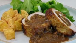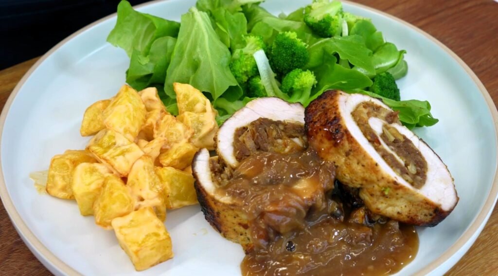 Lomito de cerdo relleno con cebollas caramelizadas, nueces y dátiles, servido con ensalada de brócoli y papas con mayonesa picante