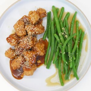 - En un tazón pequeño, mezcla el vinagre de arroz, el jengibre picado y el aceite de ajonjolí. Reserva la vinagreta a temperatura ambiente o refrigerada si se va a usar más tarde. Justo antes de servir, mezcla las habichuelas escurridas con la vinagreta previamente preparada. Sirve de inmediato junto al lomo de cerdo agridulce, decorado con ajonjolí tostado.