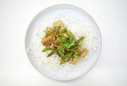 - Para servir: pones cada porción de fideos de arroz fritos en la base del plato y armas un nido, sobre el cual vas a servir el lomo de cerdo salteado con espárragos. Finaliza con hojas de cilantro fresco y cebolla larga cortada al sesgo.