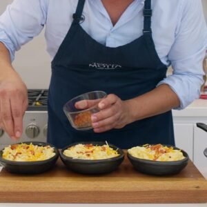- Dos opciones para servir:-Sirve el Mac & Cheese en platos individuales aptos para horno, espolvorea con los quesos reservados y un poco de tocineta crocante. Gratina hasta dorar, lo cual puede tomar de 3 a 5 minutos dependiendo de la potencia de tu horno.-Sirve inmediatamente, espolvoreando solo con la tocineta crocante.