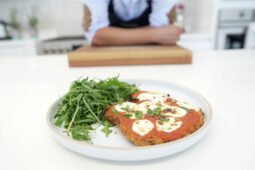 - Pones las porciones de milanesa sobre una bandeja de horno y sobre cada porción pones 2-3 cucharadas de passata (salsa de tomate), el Bocconcini partido por la mitad y algunas hojas de orégano fresco. Lo llevas al horno hasta que el queso se empiece a derretir. Depende de cada horno, pero pueden ser unos 4-6 minutos. Sirves de inmediato acompañado con la ensalada de rúgula y vinagre balsámico.