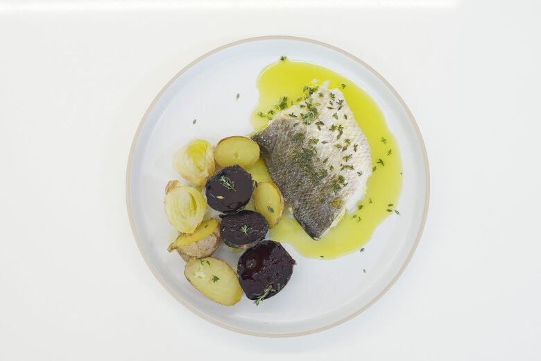 Lomito (solomillo) de res con salsa de mostaza antigua, servido con yuca y brócoli asado.