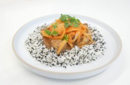 Chef John Motta – Pechuga de pollo al wok con mantequilla de maní, servida con láminas de zanahorias y arroz con ajonjolí negro