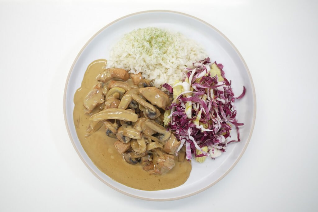 No olvides leer toda la receta para aprender a cocinar en casa Pechuga de pollo con salsa de champiñones con arroz y ensalada de radicchio.