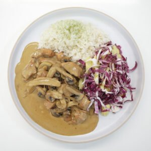 Pechuga de pollo con salsa de champiñones con arroz y ensalada de radicchio