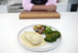 No olvides leer toda la receta para preparar en casa Pechuga de pollo con salsa de queso azul, papines y brócoli rabé a la plancha.