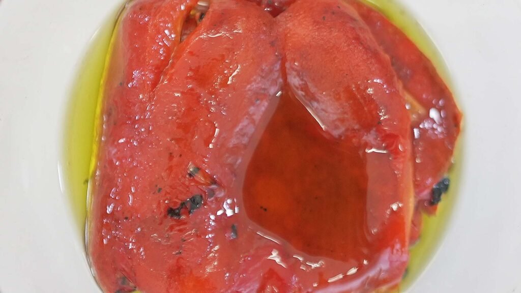 • Una vez estén pelados, los abres con el el cuchillo y les retiras las semilla y las venas internas. Apenas estén listos, los guardas en un recipiente y los cubres con aceite de oliva.