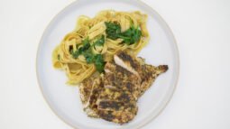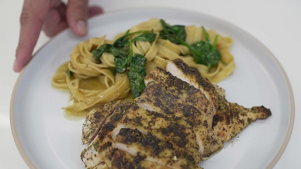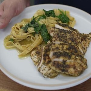 Pechuga de pollo marinada con hierbas y servida con fetuccini con limón y espinaca