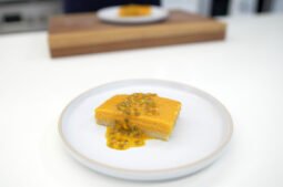 - Para servirlo, corta en porciones individuales y, luego, coloca una cucharadita de pulpa de maracuyá fresca, incluyendo las semillas.