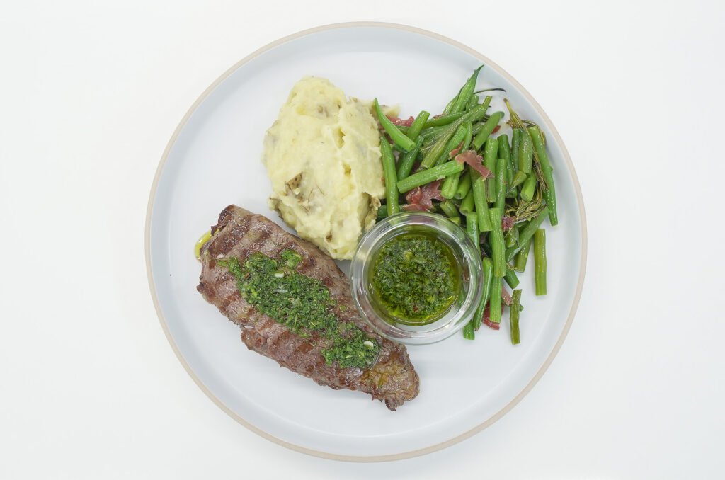 Punta de anca con chimichurri, puré de papa y habichuelas salteadas con mantequilla y prosciutto