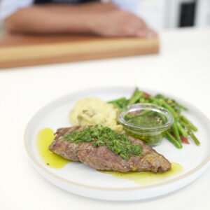La punta de anca es uno de esos cortes de carne que destaca por su sabor intenso y su jugosidad, convirtiéndolo en la estrella de cualquier parrilla o asado. En esta receta, lo acompañamos con el clásico y aromático chimichurri, un puré de papa cremoso y habichuelas salteadas con mantequilla y prosciutto. La combinación de estos elementos crea un plato equilibrado, lleno de sabor y con texturas que lo hacen irresistible.