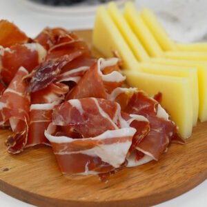 - Coloca las láminas de jamón serrano o jamón ibérico, de manera que cubras el resto de la tabla, organizando de manera que se vea atractiva. Si la vas a reservar para mas adelante, cubrela con papel transparente, sin templarlo, hasta el momento de pasar a la mesa.
