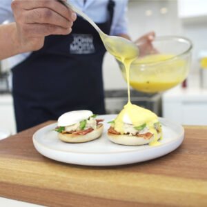- Gradualmente y trabajando sobre el baño maría vas agregando la mantequilla clarificada sin dejar de batir hasta lograr una consistencia espesa en la salsa.