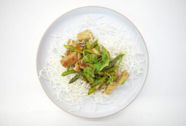 Lomo de cerdo al wok con espárragos, servido con fideos de arroz fritos: sabores orientales con un toque crujiente