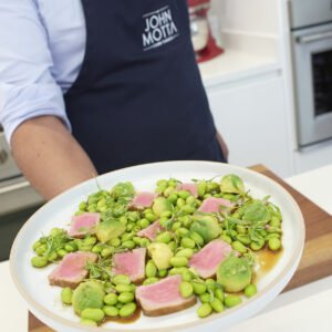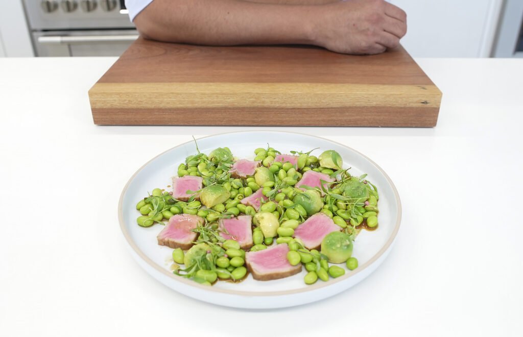 - Cuando el atún esté bien frio y haya reposado en refrigeración por mínimo 30 minutos, coártalo en laminas de 5mm y lo sirves cada porción en un plato plano, dispuestas las laminas sobre el plato, cubriendo toda la base y lo acompañas con la ensalada de edamames y aguacate.