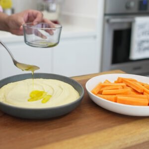 - Para servir, dispon el hummus en un plato, crea un pequeño pozo en el centro y vierte un chorrito de aceite de ajonjolí para enriquecer su sabor. Acompaña esta receta con los bastones de zanahoria.
