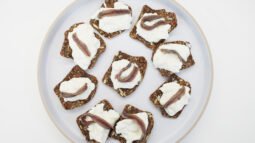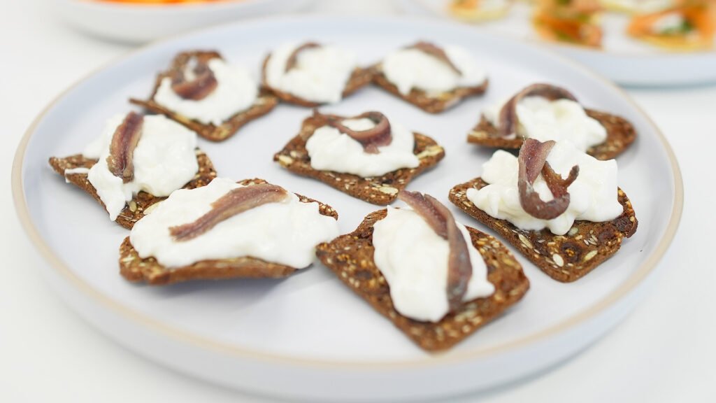 - Con la ayuda de una cuchara, rompe la burrata y mezcla bien su contenido. A continuación, coloca una pequeña porción de stracciatella —que es el relleno cremoso de la burrata— sobre cada tostada de pan. Por último, añade una anchoa en cada una de ellas.