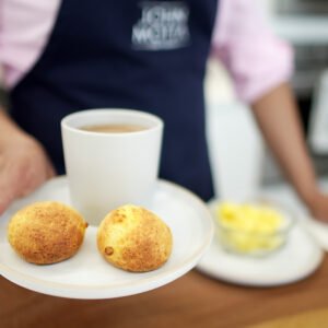 Sirve las almojábanas acompañadas de tu bebida caliente favorita y una porción de fruta, creando así un desayuno completo y delicioso.