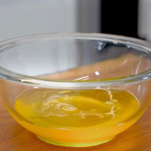 Una vez que la mantequilla esté completamente clara y los sólidos lácteos se hayan depositado en el fondo, retira la olla del fuego y deja que se enfríe un poco.